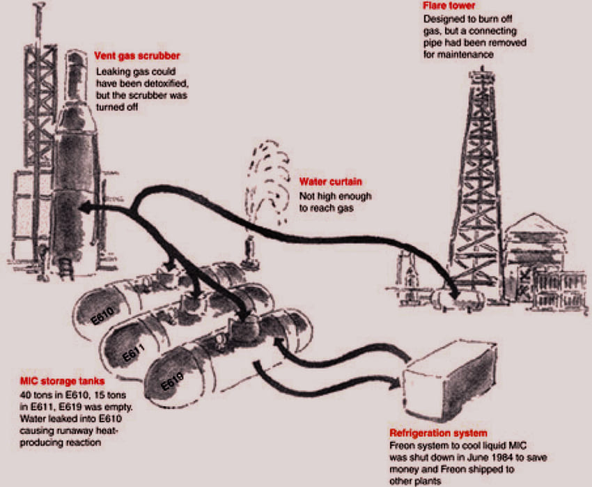Now, some reports say that the vent gas scrubber was out of service for maintenance at the time of leak while other reports suggest that it was indeed working, and it was the flowmeter which was nonfunctional. But even it is believed that the scrubbers were working, fact of the matter is they could not come to the rescue.