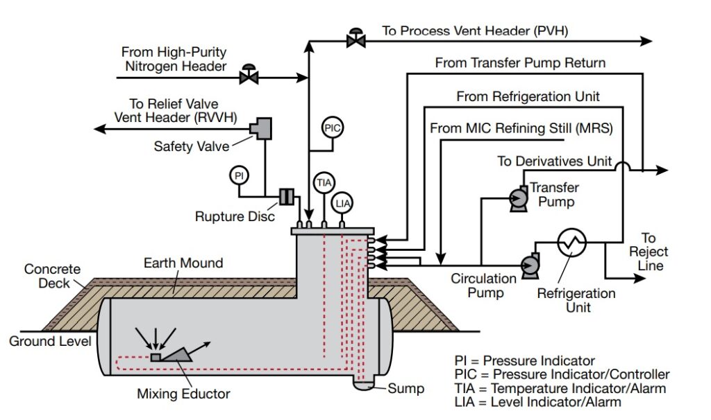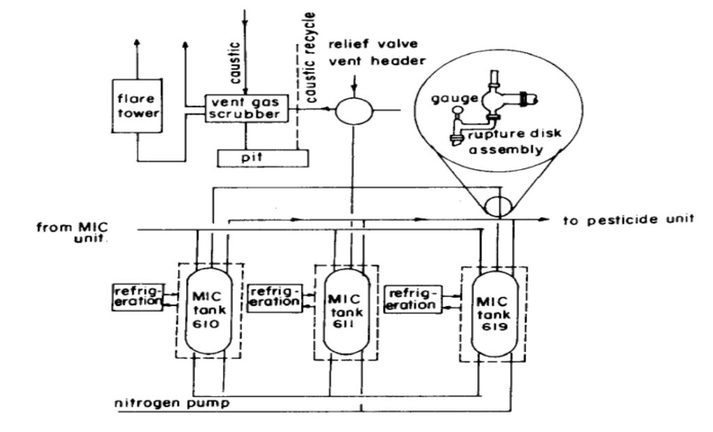 MIC being a highly volatile and flammable gas required something to keep its temperature under control at all times. The ideal temperature that was desired was anywhere between 0 and 15 degrees Celsius. To do exactly that, a nitrogen gas padding was installed inside the tanks to keep the gas cool.